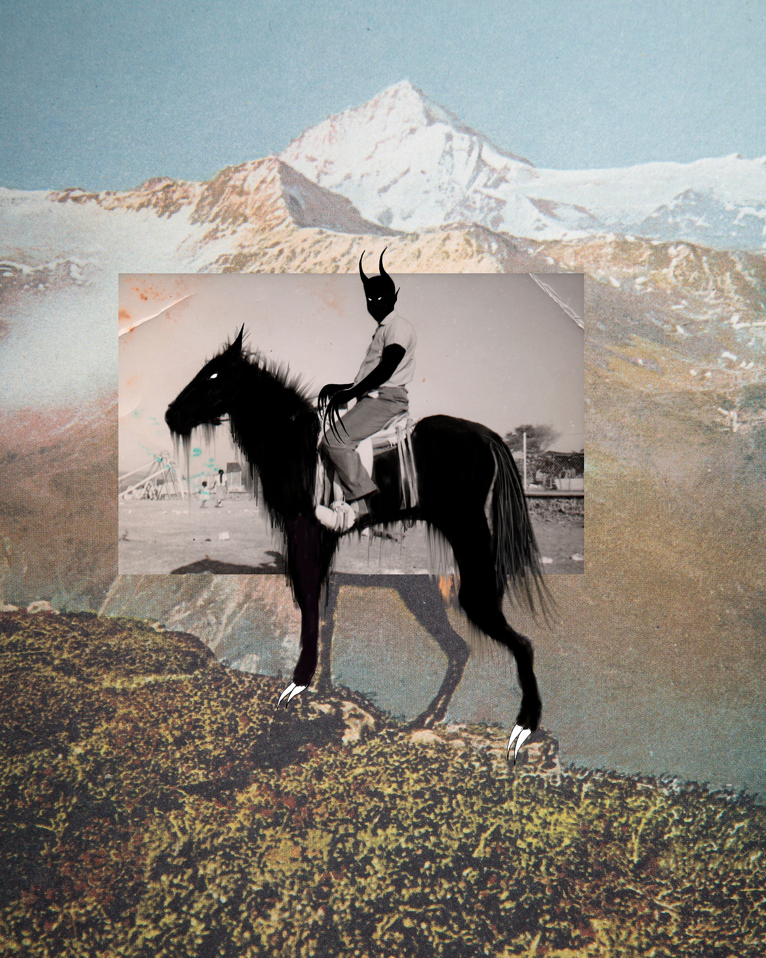 El Charro Negro comes from the series THE HOLY MOUNTAINS. It is a hybrid project that blends two worlds: Mexico and Switzerland, where I belong. Through my family photo archive, graphic intervention, and collage, I explore popular mythology. Based on legends and magical stories, I draw analogies between the archives of both territories, creating new invented realities with the help of the oral tradition of the women in my family, mainly my maternal grandmother. Mexican mythology, like its population, reflects a mixture of indigenous and Spanish influences.