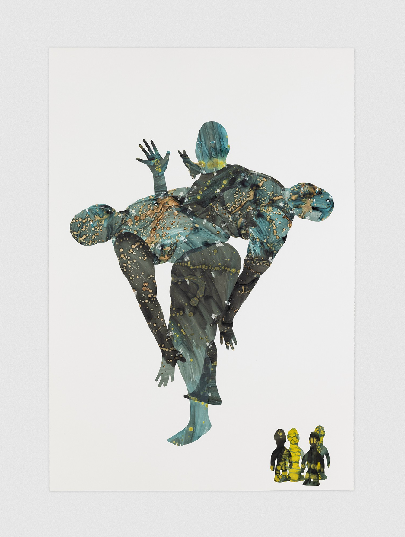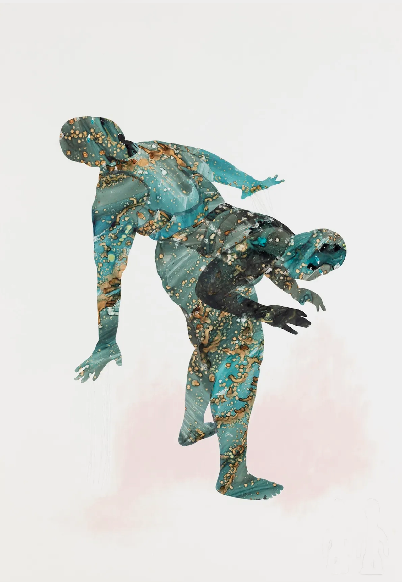“I express the idea that we as human beings contain multitudes. Using ink, glitter, and pigment, I form figures that are at once earthly, yet suggestive of the cosmos. As my voluptuous figures meld and engage with one another, the familiar form of my own body becomes enveloped with multiple repeating bodies. The fluid and fleshy bodies shift and transform, never alone, they hold space, they wash over, they embrace, they give life, and they tear apart.”