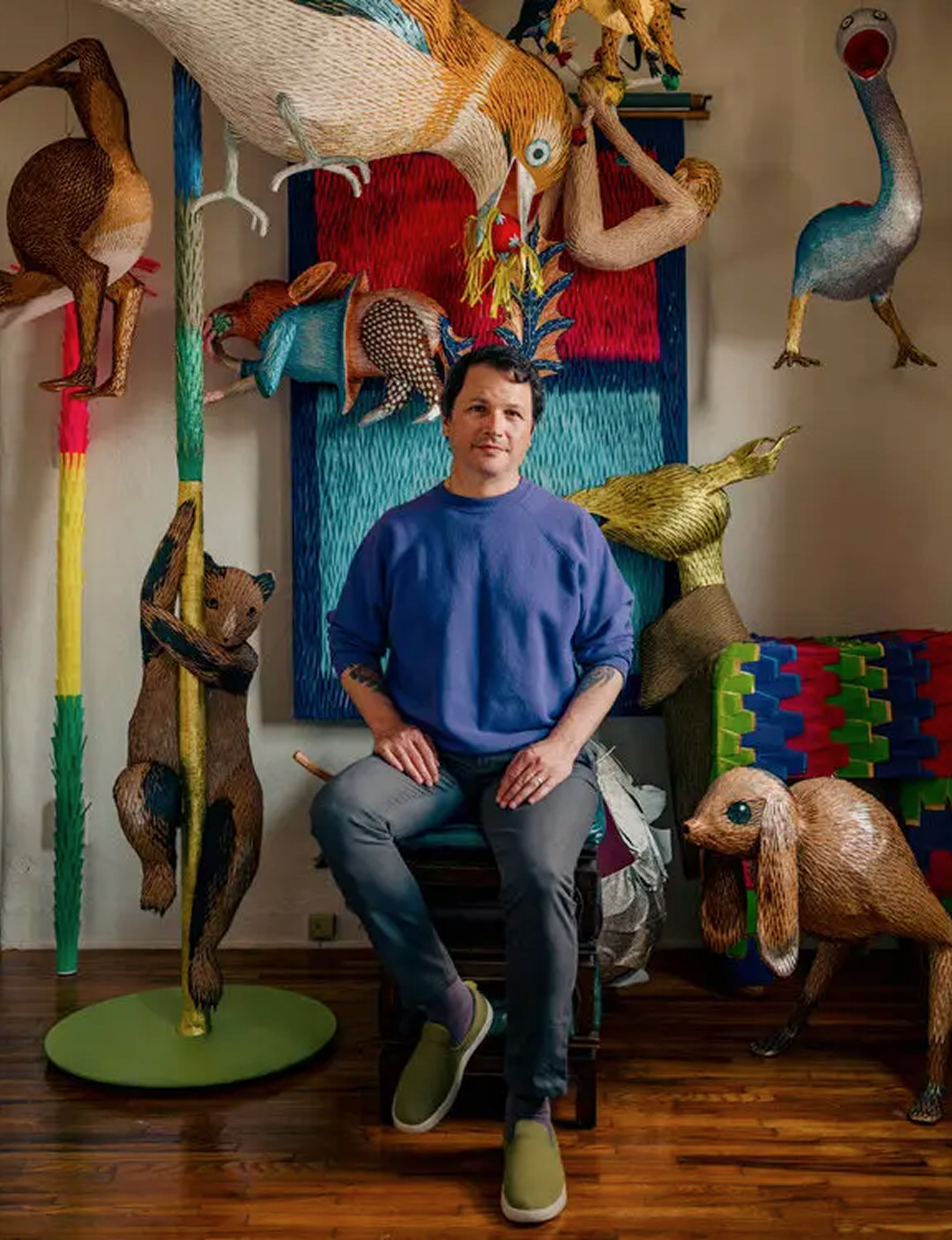 His sculptures have been featured in national, international and on-line publications including American Craft Magazine, ARTnews, Artsy, Atlas Obscura, Audubon Magazine, The Guardian, hifructose.com, Hyperallergic, LUXE Interiors + Design, Politiken, The New York Times and This Is Colossal. Most recently he was featured in the New York Times Series “The Art of Craft.” Benavidez has shown in group and solo exhibitions, including at the AD&A Museum at UCSB, Craft In America, Mingei International Museum, Palo Alto Art Center, Self Help Graphics, Mesa Contemporary Art Museum and Riverside Art Museum; his work was included in the 2024 Homo Faber Biennial in Venice, Italy he was included in the 2025 Cheongju Craft Biennale in Cheongju, South Korea. Metro commissioned him to contribute to the “Through the Eyes of Artists” poster series (2019); his Bosch fruit fascinators are featured in the finale of The Interview with the Vampire series on AMC+. He is also featured in the “Play” episode of the Craft In America PBS series, and is the subject of the 2024 documentary short “Piñatas of Earthly Delights” directed by Tom Maroney.