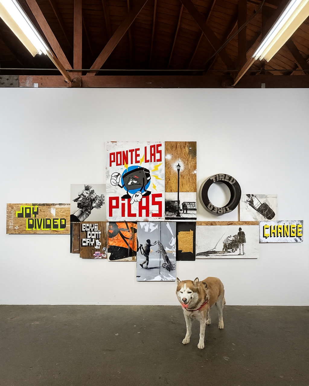 The installation is comprised of multiple elements. It combines works from my Imaginary Found Objects series (an ongoing project that incorporates musings on imagined signage based on words, phrases, and typography inspired by vernacular graphics from my city of birth (CDMX) and the city I call home (Los Angeles); works from my Means of Production series, centering instances of the existence and resilience of working class folx in marginalized and working class communities, primarily in L.A. and incorporating the commonalities that tie us with other people across the global south and the world at large." - Raymundo T. Reynoso