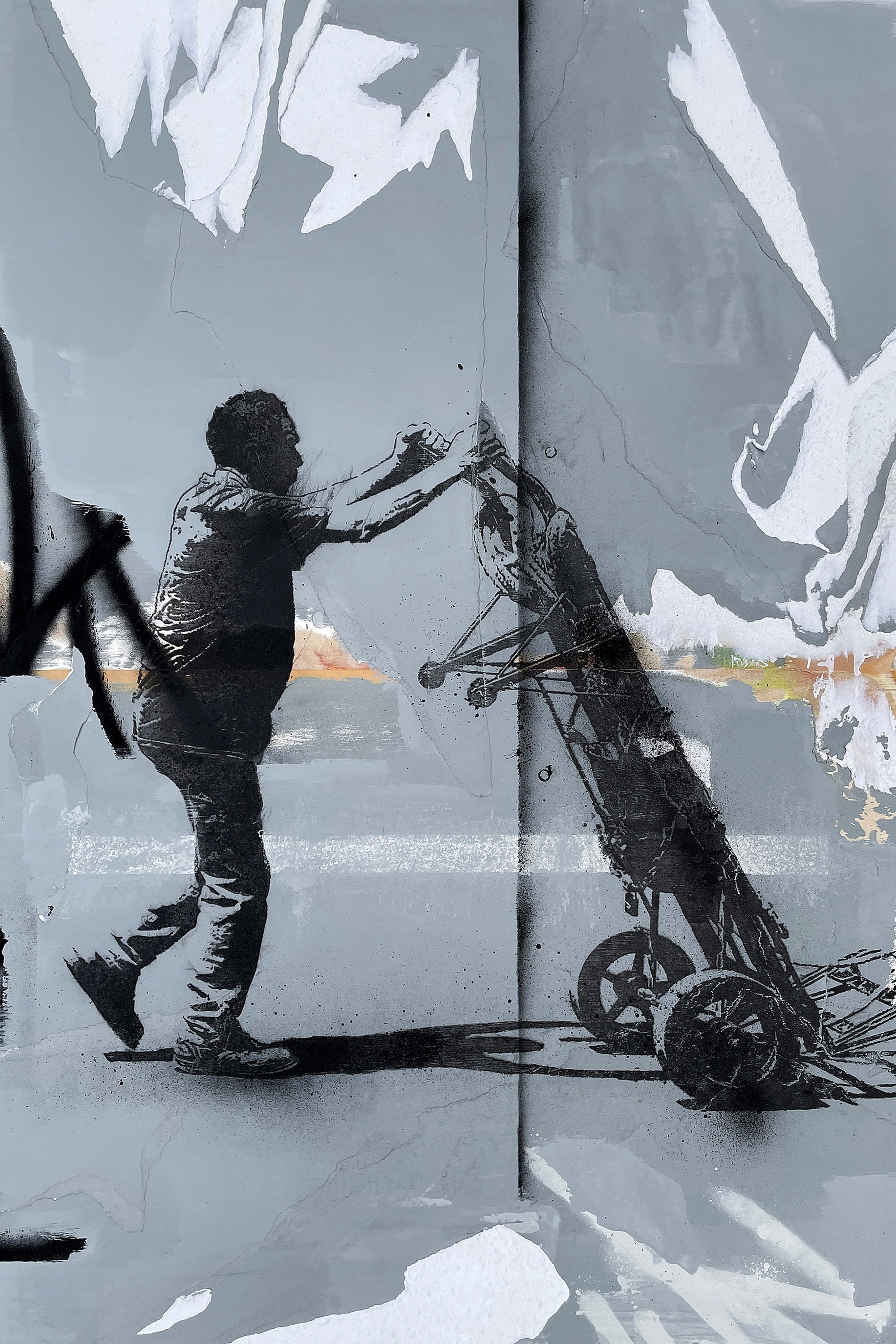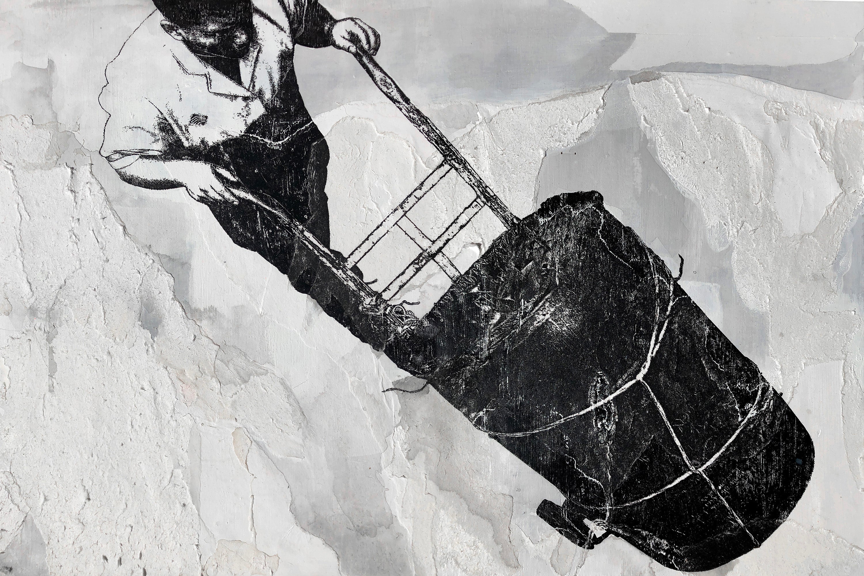 Recortes is a portrait of a worker in CDMX transporting a barrel.