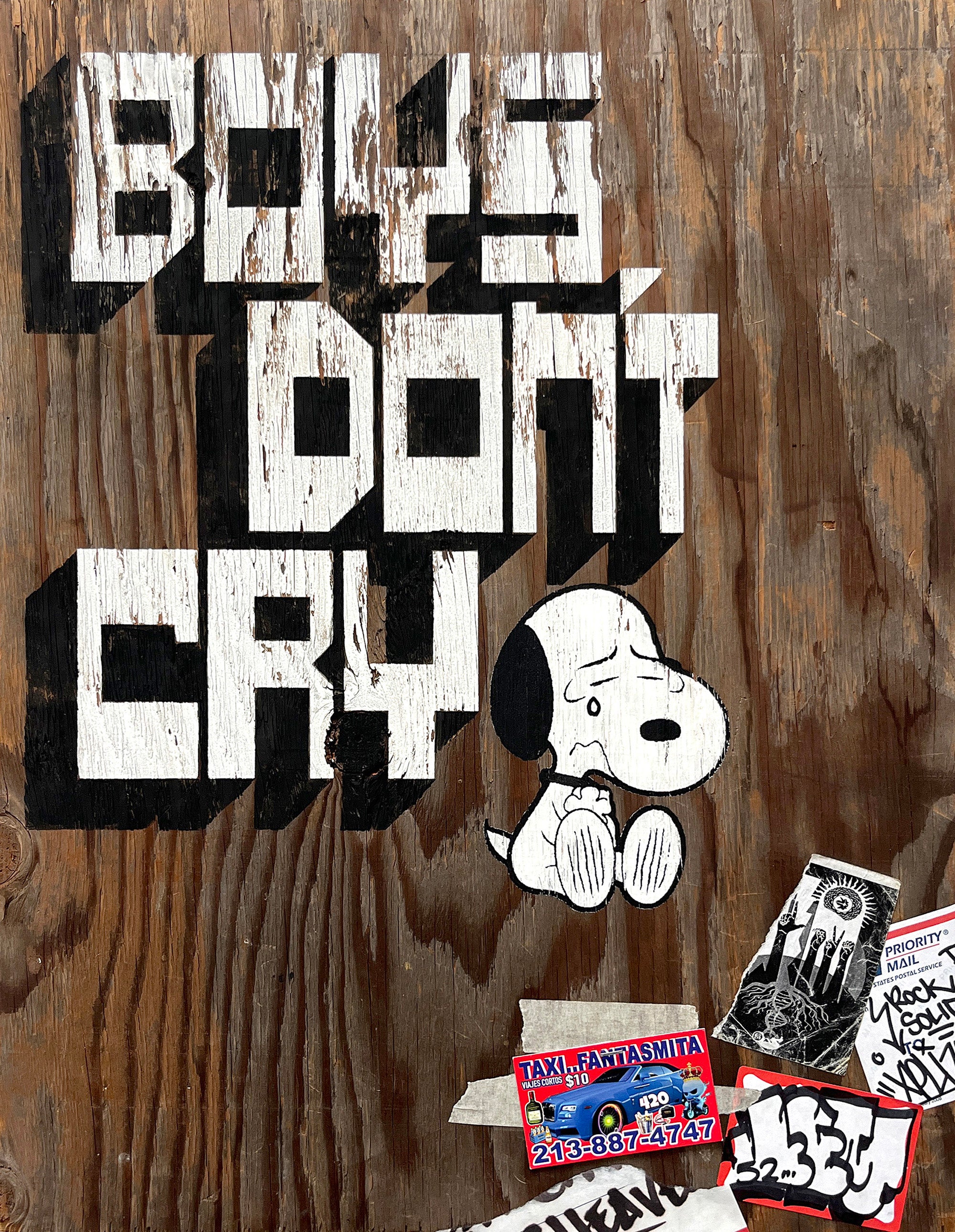 The installation is comprised of multiple elements. It combines works from my Imaginary Found Objects series (an ongoing project that incorporates musings on imagined signage based on words, phrases, and typography inspired by vernacular graphics from my city of birth (CDMX) and the city I call home (Los Angeles); works from my Means of Production series, centering instances of the existence and resilience of working class folx in marginalized and working class communities, primarily in L.A. and incorporating the commonalities that tie us with other people across the global south and the world at large