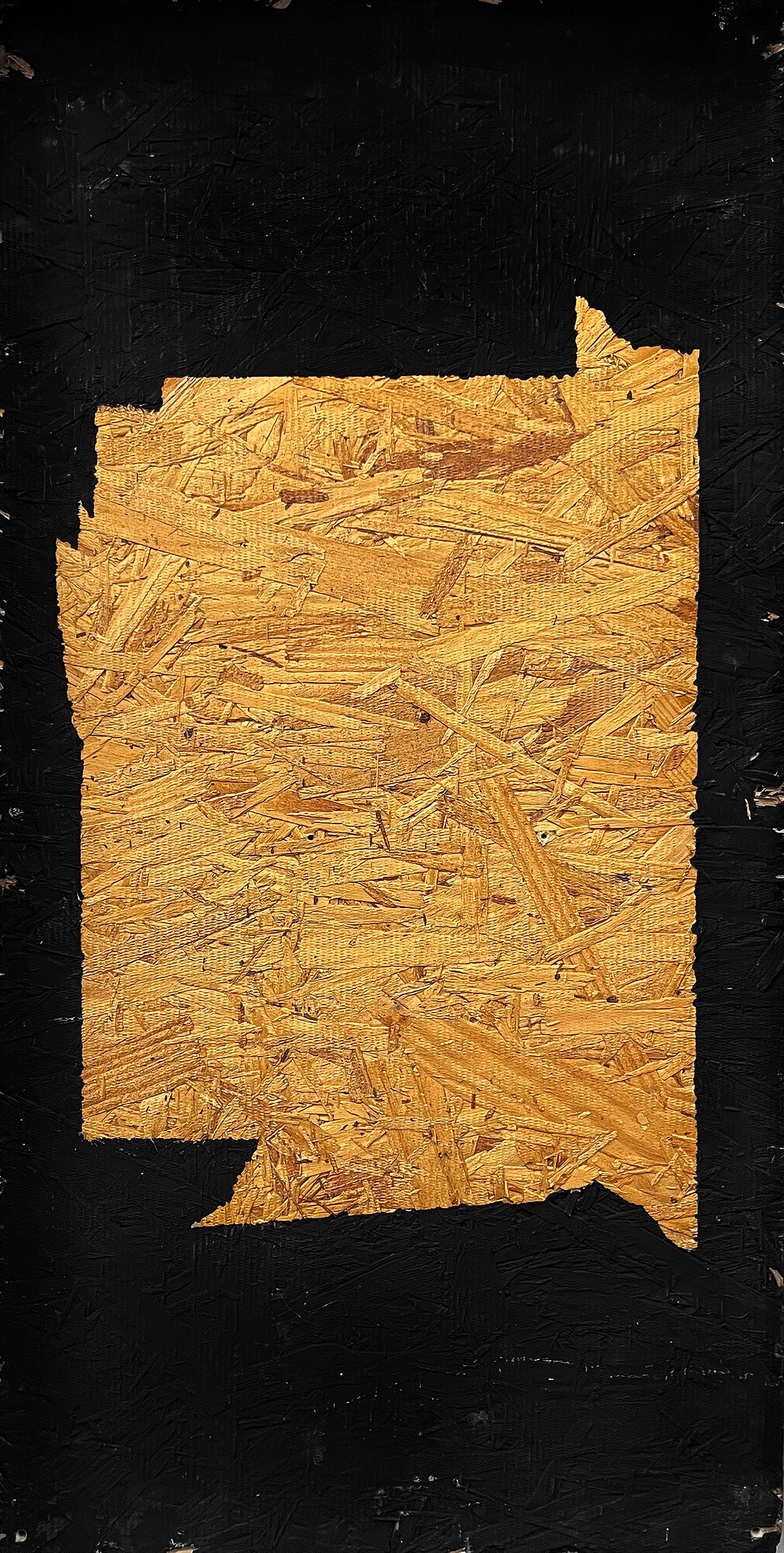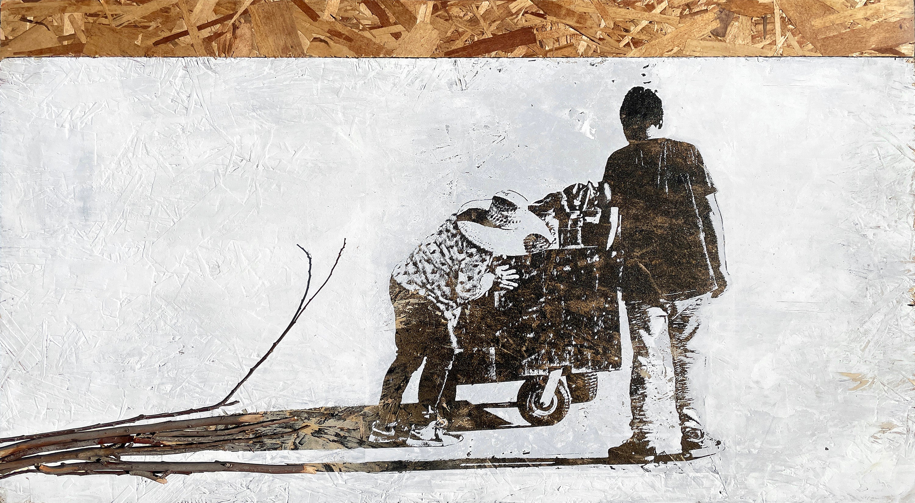 Acrylic, screenprint, spray paint, branches on OSB, 2025